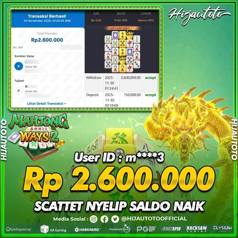Selamat Kepada Member HIJAUTOTO H*******34 Telah Jackpot Di SLOT MAHJONG WAYS 2
