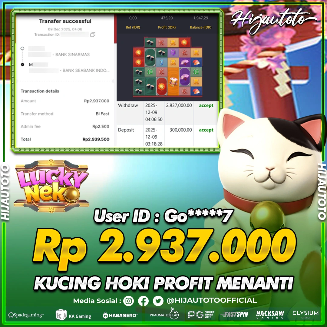 Selamat Kepada Member HIJAUTOTO GO*****7 Telah Jackpot Di SLOT LUCKY NEKO