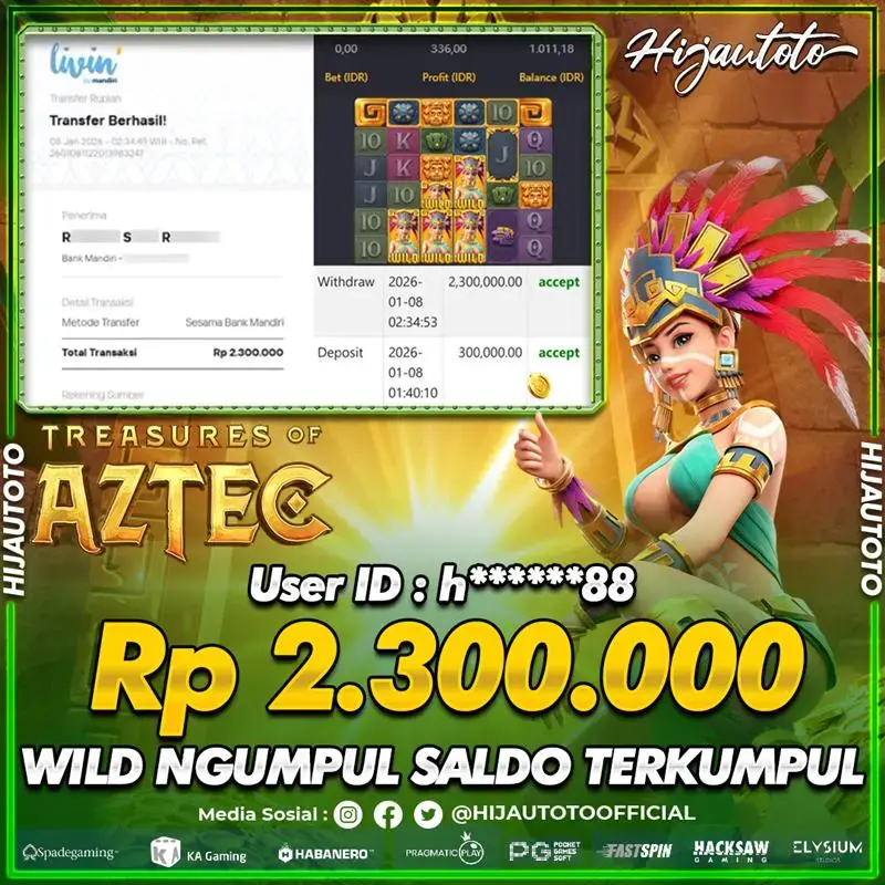 Selamat Kepada Member HIJAUTOTO H******88 Telah Jackpot Di SLOT TREASURES OF AZTEC