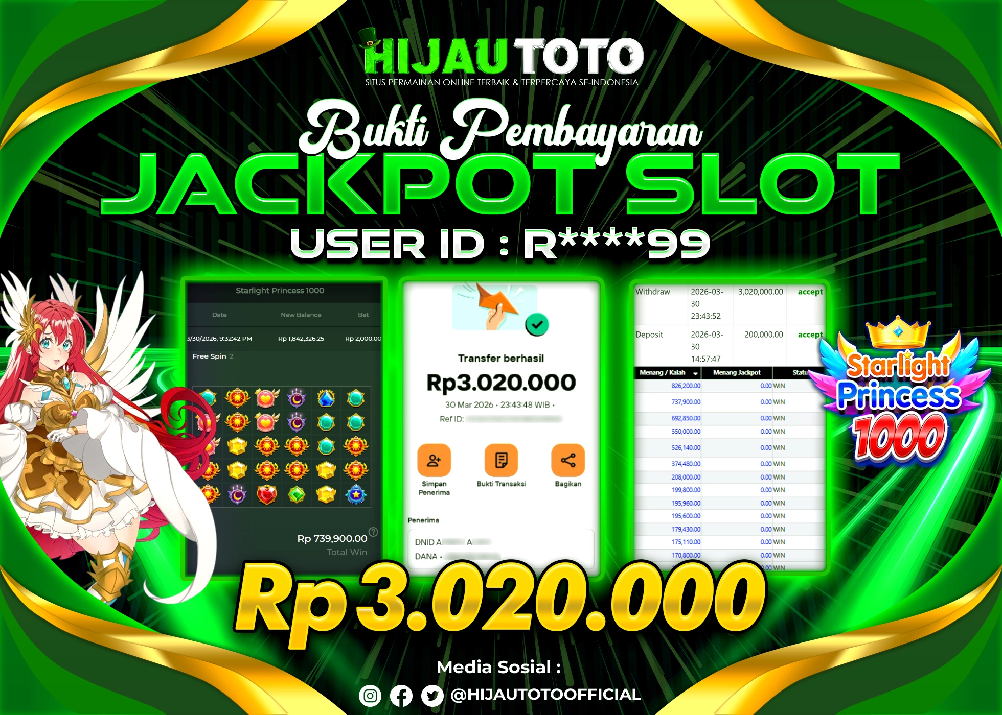 Selamat Kepada Member HIJAUTOTO R*****9 Telah Jackpot Di SLOT STARLIGHT PRINCESS 1000