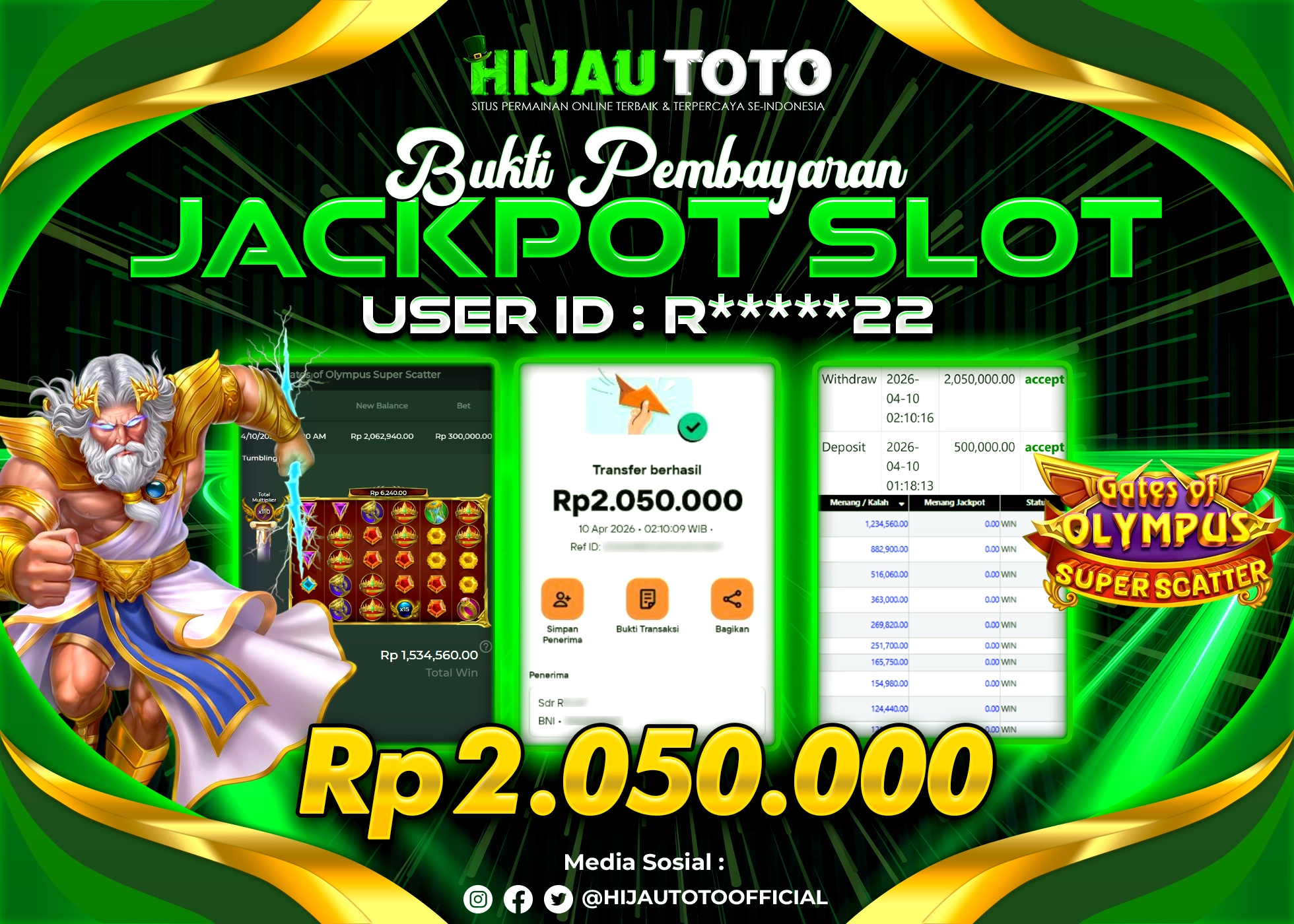 Selamat Kepada Member HIJAUTOTO R*****22 Telah Jackpot Di SLOT GATES OF OLYMPUS SUPER SCATTER