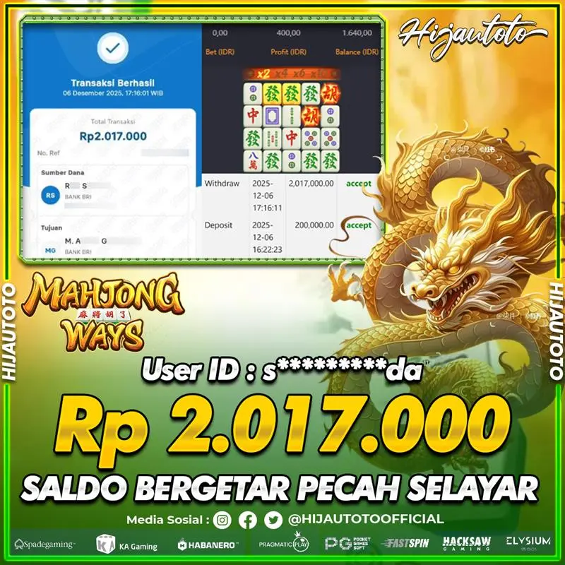 Selamat Kepada Member HIJAUTOTO S*********DA Telah Jackpot Di SLOT MAHJONG WAYS