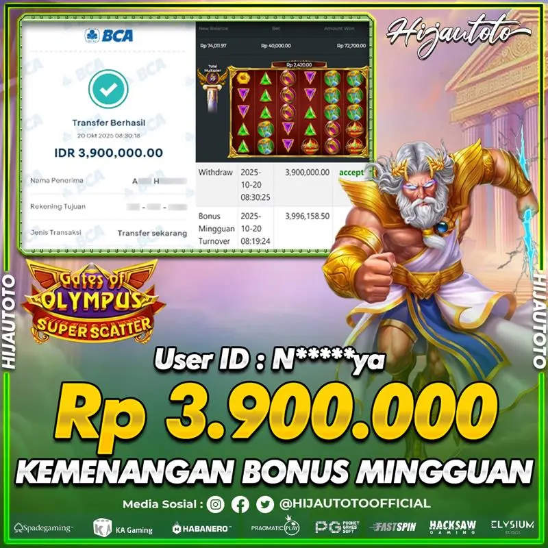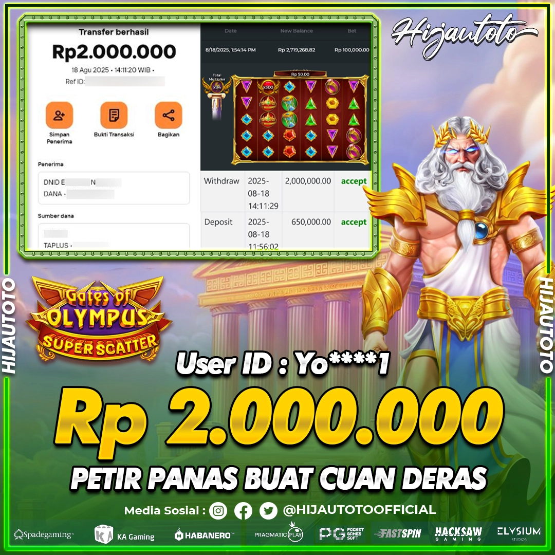 Selamat Kepada Member HIJAUTOTO YO****1 Telah Jackpot Di SLOT GATES OF OLYMPUS SUPER SCATTER