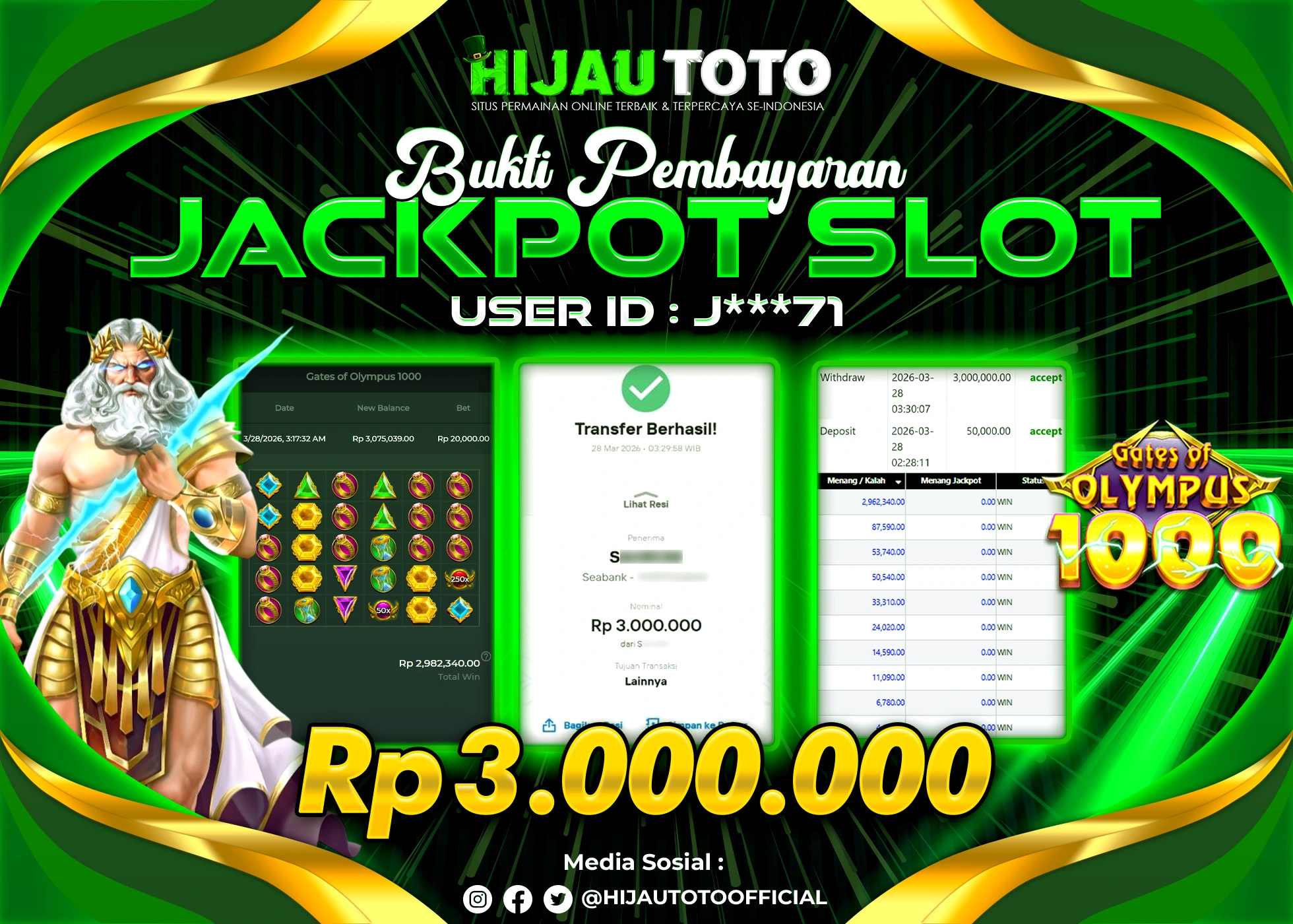 Selamat Kepada Member HIJAUTOTO J****1 Telah Jackpot Di SLOT GATES OF GATOT KACA 1000