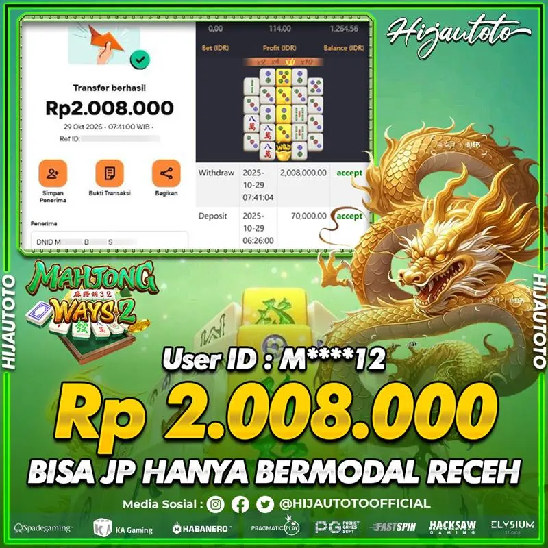 Karena berhasil memenangkan Rp.Rp.2.300.000 dari permainan seru SLOT MAHJONG WAYS di HIJAUTOTO! πŸ’°πŸ’Έ