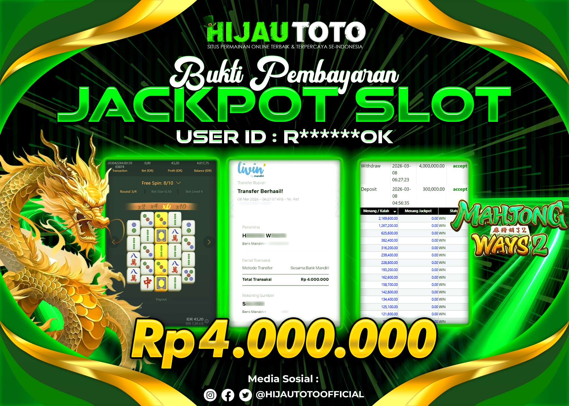 Bergabung dengan HIJAUTOTO sangat mudah dan cepat. Cukup lakukan pendaftaran dengan data lengkap, lakukan deposit minimal Rp5.000 melalui berbagai metode termasuk QRIS, dan mulai bertaruh dengan minimal taruhan Rp100. Dapatkan juga bonus new member 100% untuk modal bermain lebih besar.