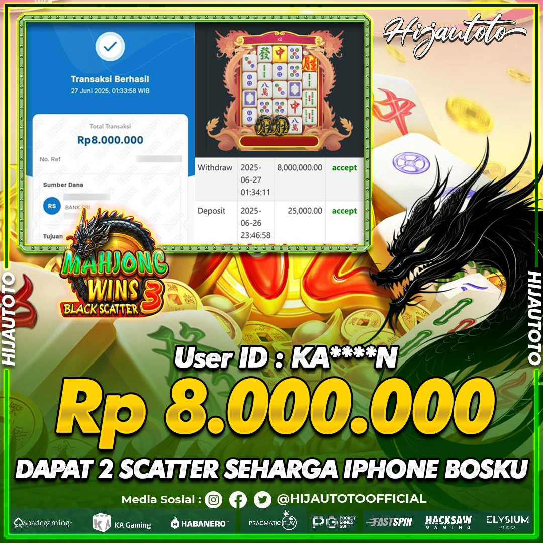 Selamat Kepada Member HIJAUTOTO KA****N Telah Jackpot Di SLOT MAHJONG WINS 3 BLACK SCATTER