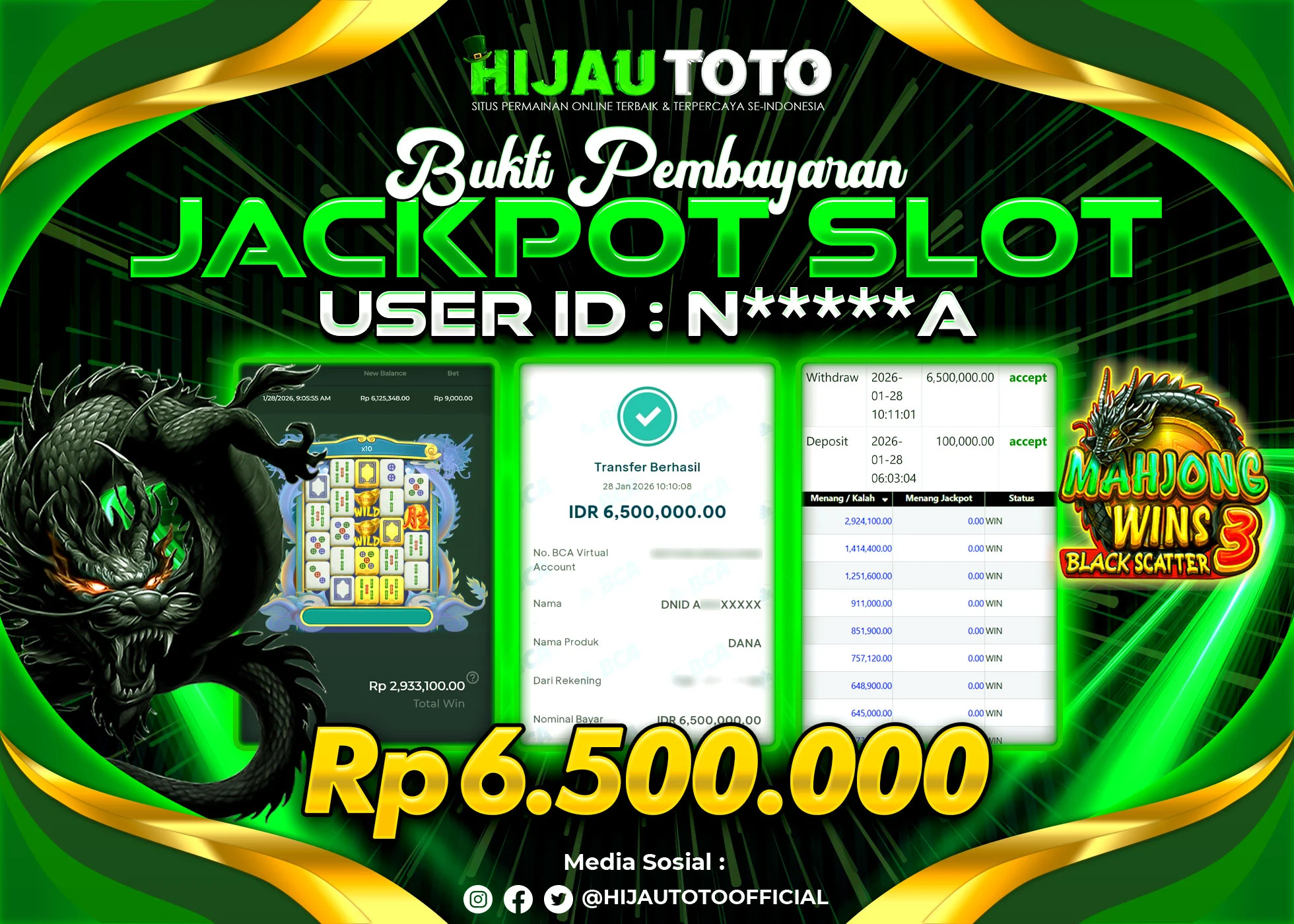Selamat Kepada Member HIJAUTOTO N*****A Telah Jackpot Di SLOT MAHJONG WINS 3 BLACK SCATTER