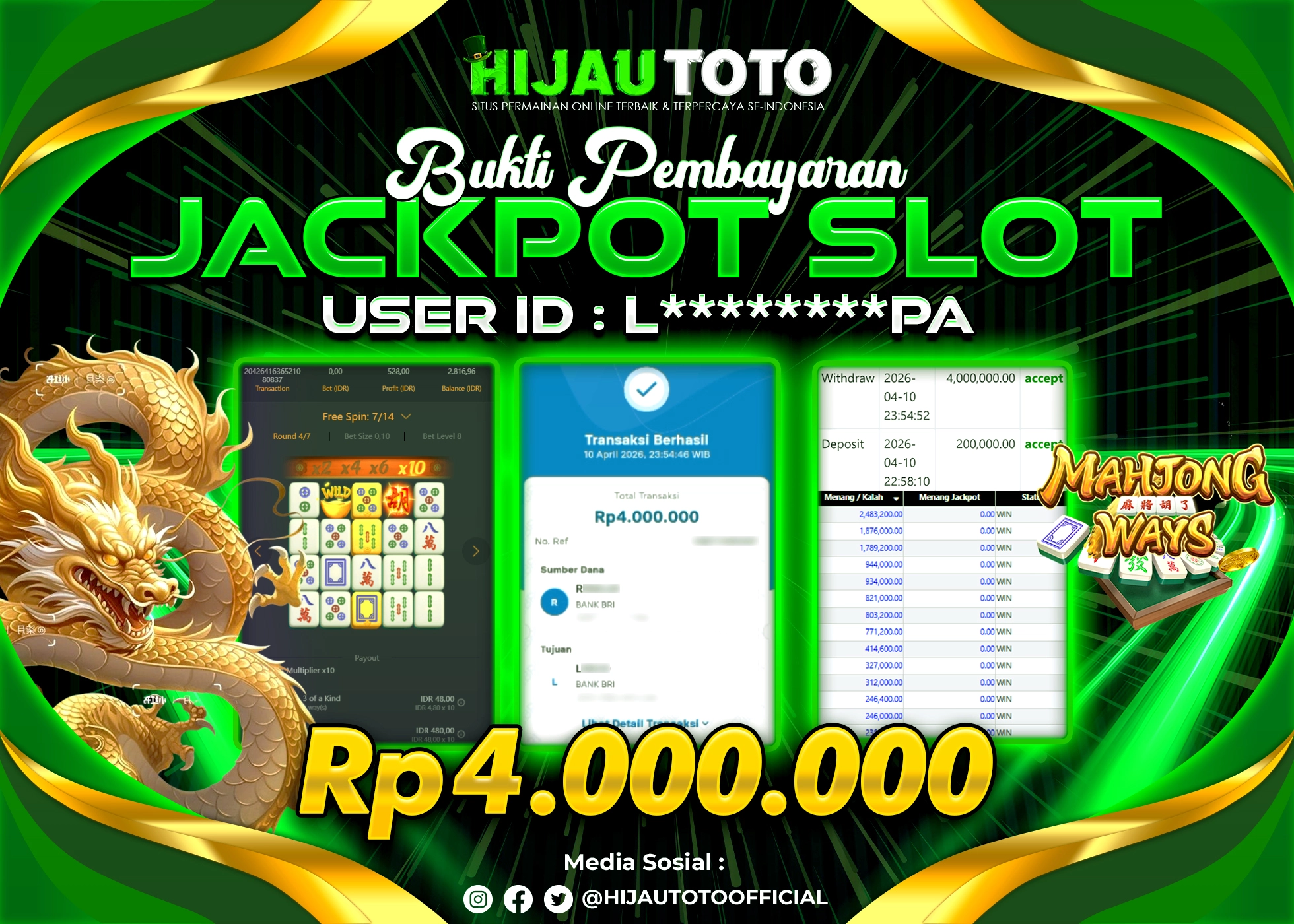 Selamat Kepada Member HIJAUTOTO L********PA Telah Jackpot Di SLOT MAHJONG WAYS