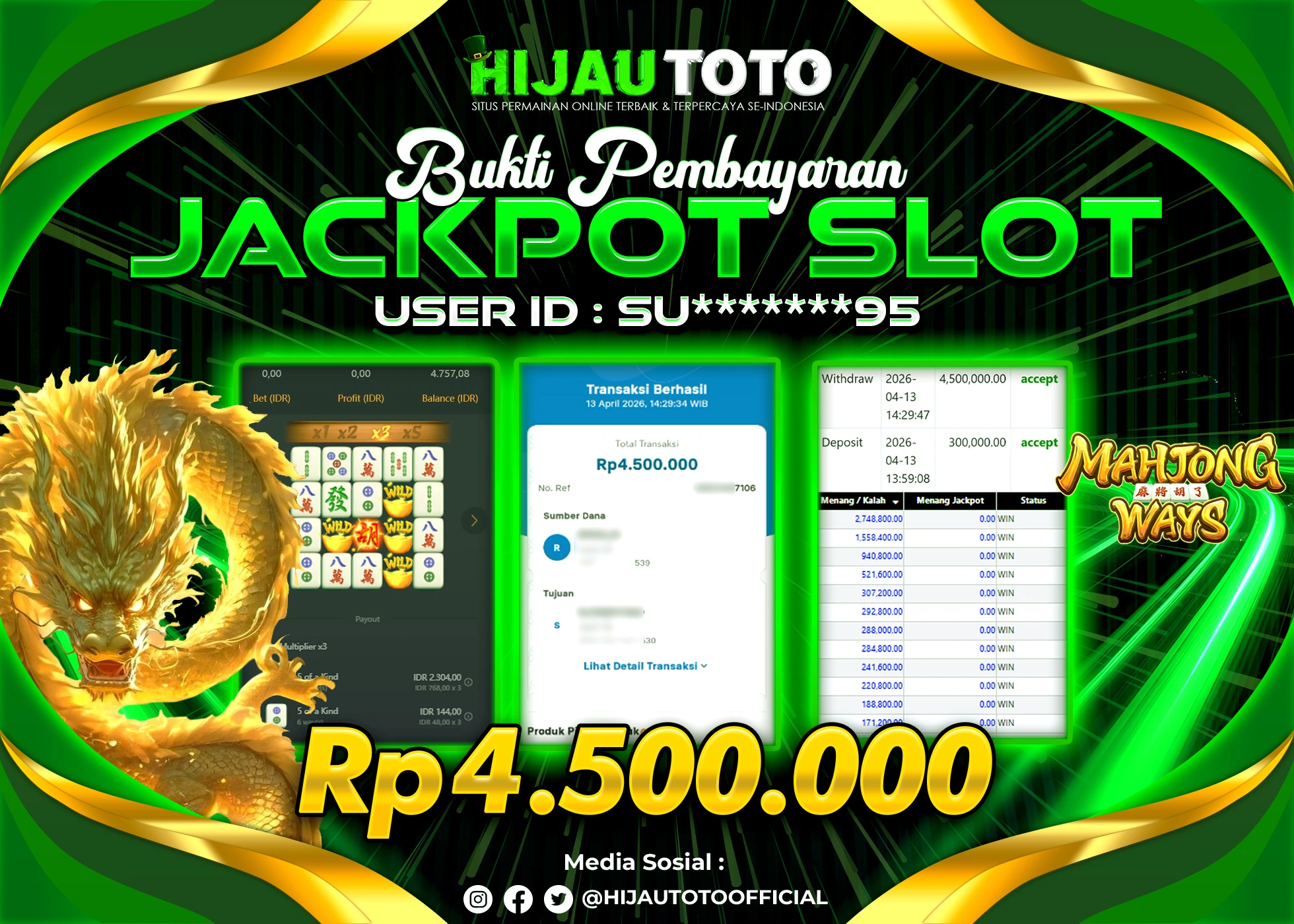 Selamat Kepada Member HIJAUTOTO SU********95 Telah Jackpot Di SLOT MAHJONG WAYS
