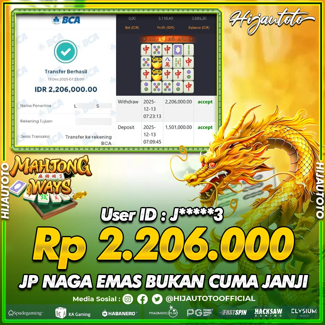 Selamat Kepada Member HIJAUTOTO J*****3 Telah Jackpot Di SLOT MAHJONG WAYS