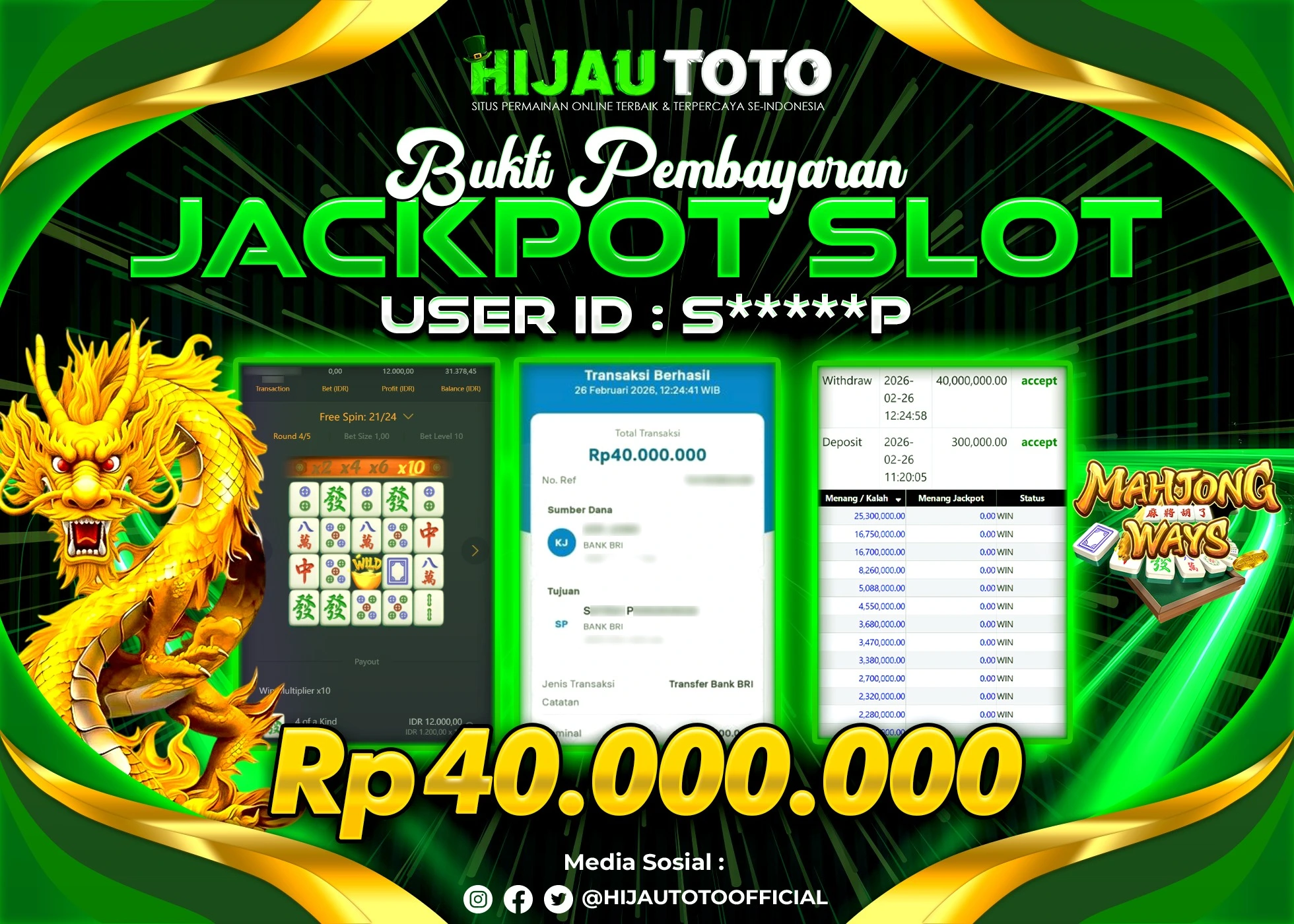 Bergabung dengan HIJAUTOTO sangat mudah dan cepat. Cukup lakukan pendaftaran dengan data lengkap, lakukan deposit minimal Rp5.000 melalui berbagai metode termasuk QRIS, dan mulai bertaruh dengan minimal taruhan Rp100. Dapatkan juga bonus new member 100% untuk modal bermain lebih besar.