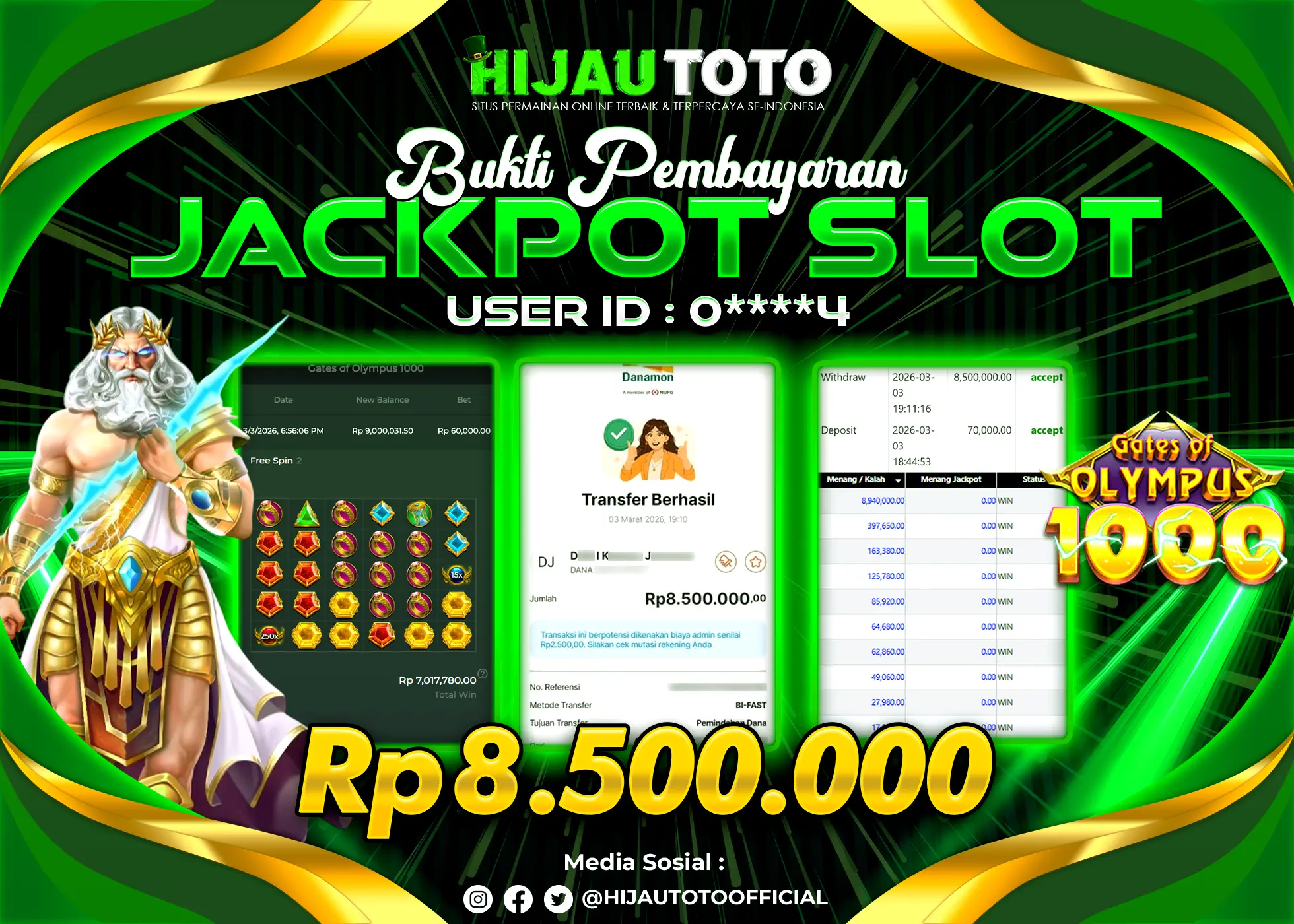 Selamat Kepada Member HIJAUTOTO 0****4 Telah Jackpot Di SLOT GATES OF OLYMPUS 1000