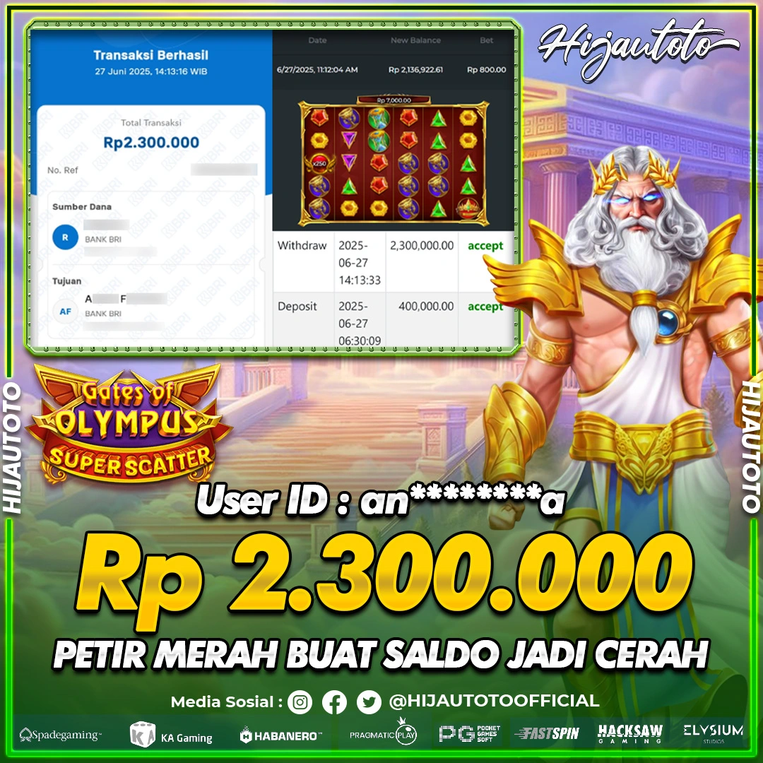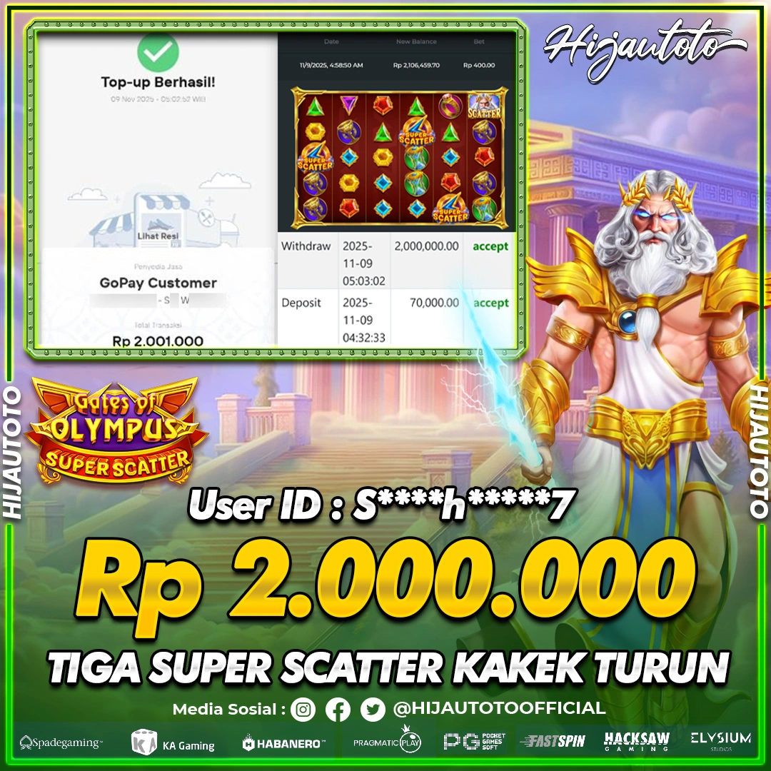 Selamat Kepada Member HIJAUTOTO AN*********A Telah Jackpot Di SLOT GATES OF OLYMPUS SUPER SCATTER