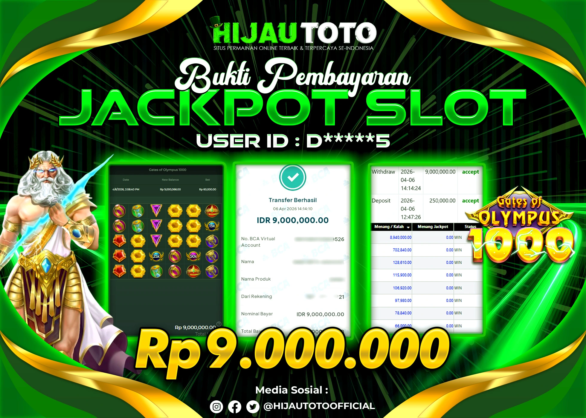 Selamat Kepada Member HIJAUTOTO D*****5 Telah Jackpot Di SLOT GATES OF OLYMPUS 1000
