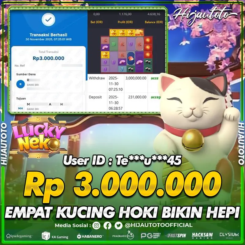 Selamat Kepada Member HIJAUTOTO TE*********45 Telah Jackpot Di SLOT LUCKY NEKO