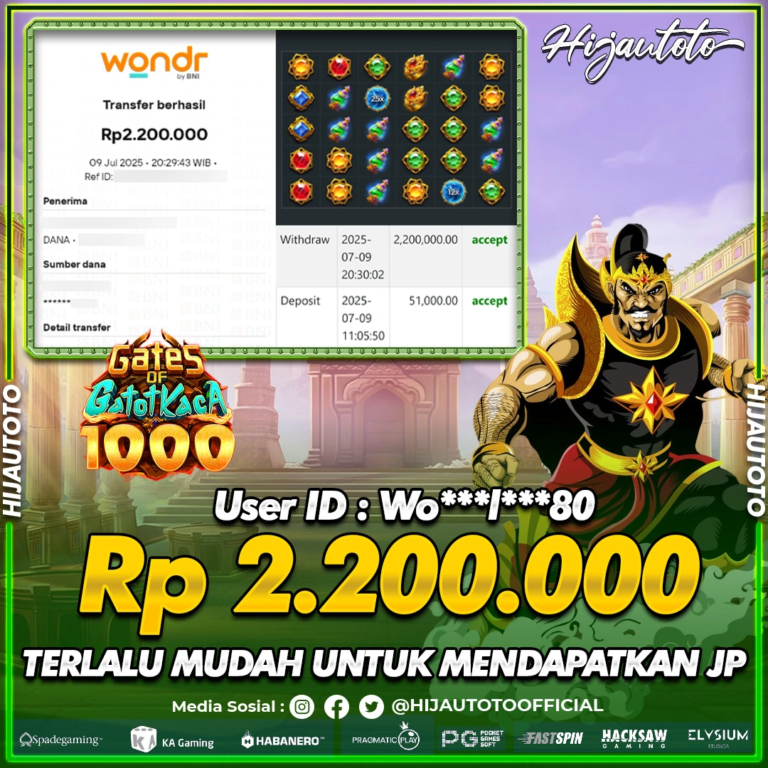 Selamat Kepada Member HIJAUTOTO WO*******80 Telah Jackpot Di SLOT GATES OF GATOTKACA 1000
