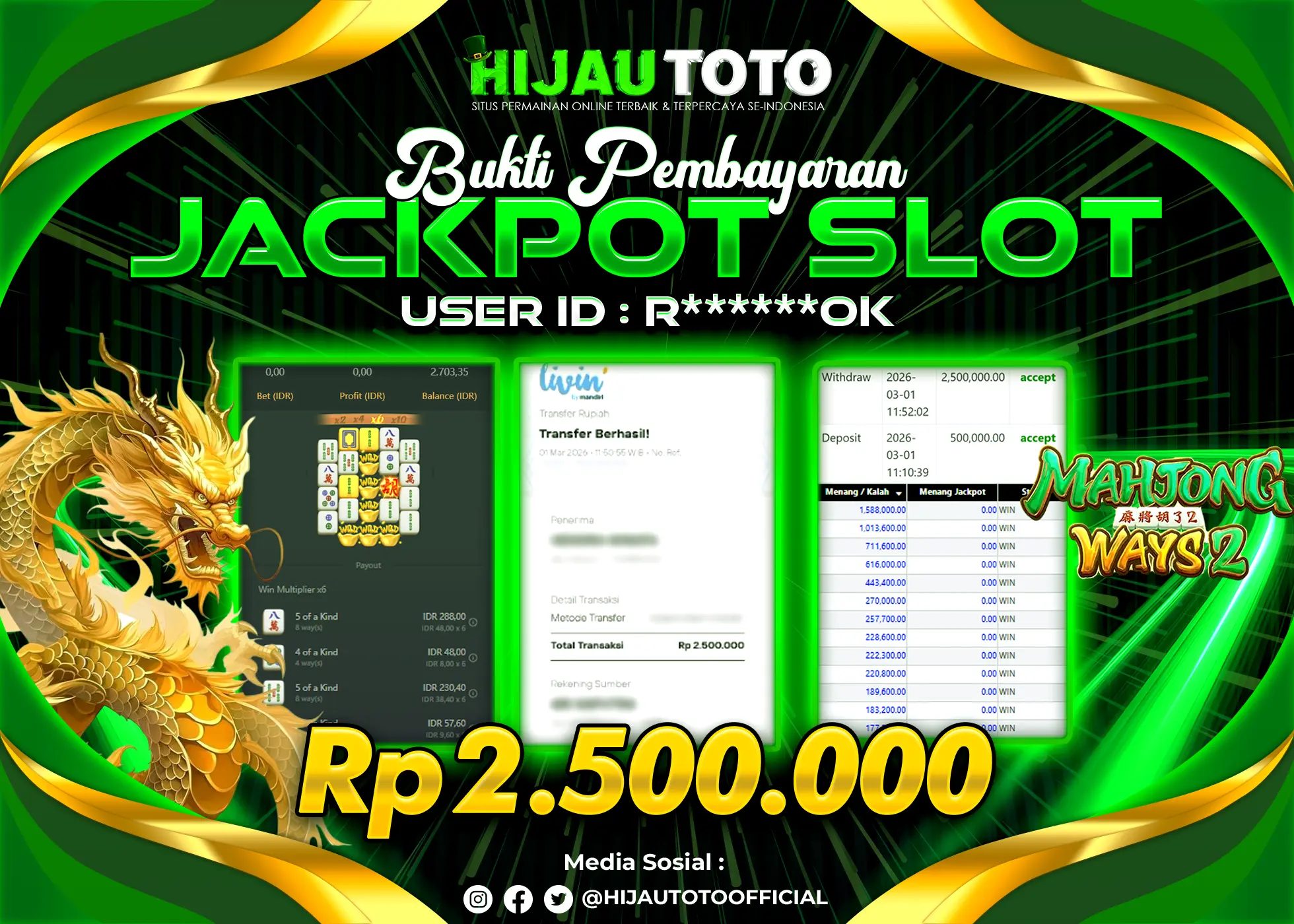 Bergabung dengan HIJAUTOTO sangat mudah dan cepat. Cukup lakukan pendaftaran dengan data lengkap, lakukan deposit minimal Rp5.000 melalui berbagai metode termasuk QRIS, dan mulai bertaruh dengan minimal taruhan Rp100. Dapatkan juga bonus new member 100% untuk modal bermain lebih besar.
