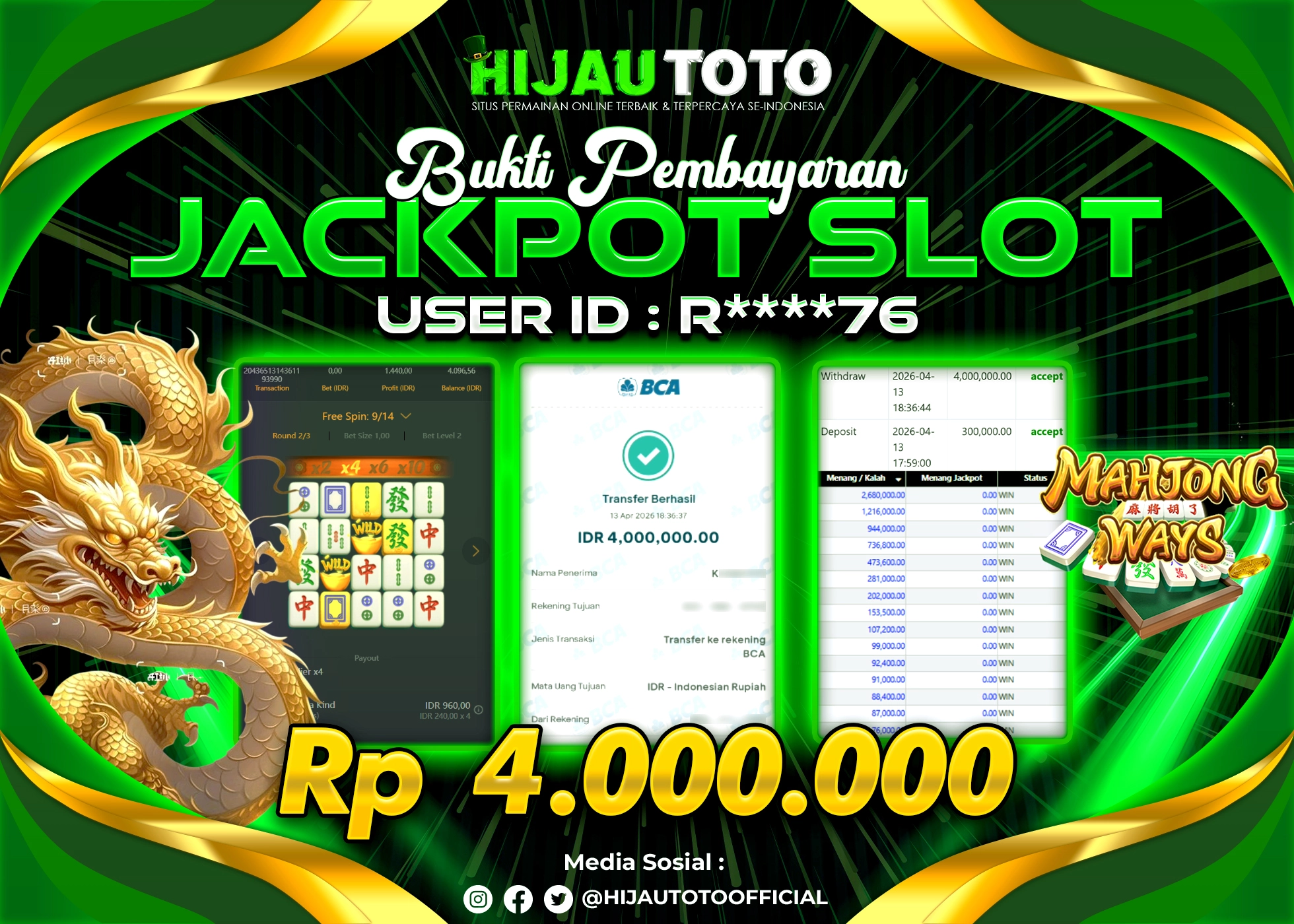 Bergabung dengan HIJAUTOTO sangat mudah dan cepat. Cukup lakukan pendaftaran dengan data lengkap, lakukan deposit minimal Rp5.000 melalui berbagai metode termasuk QRIS, dan mulai bertaruh dengan minimal taruhan Rp100. Dapatkan juga bonus new member 100% untuk modal bermain lebih besar.