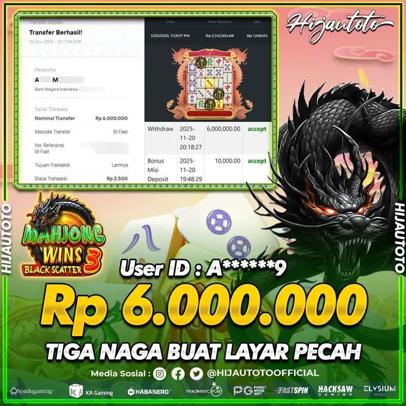 Selamat Kepada Member HIJAUTOTO M****L Telah Jackpot Di SLOT MAHJONG WAYS