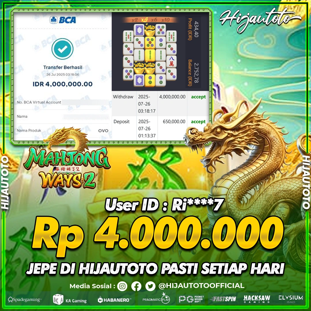 Selamat datang di HIJAUTOTO, tempatnya seru-seruan dan cuan besar! Mulai main cukup dengan modal Rp5.000 aja, taruhan super murah dari Rp100 perak! Mau main slot yang penuh warna? Atau togel dari 20 pasaran paling hits? Atau mungkin tembak ikan yang bikin deg-degan? Tenang, ada juga taruhan bola, sabung ayam, dan live casino yang bikin suasana makin hidup! Daftar sekarang dan dapetin bonus new member 100% langsung, biar modalmu makin tebal. Deposit gampang banget, bisa pakai QRIS, dan kalau butuh bantuan, customer service kita siap 24 jam nonstop. Jadi, tunggu apa lagi? Yuk, gabung dan bawa pulang kemenangannya cuma di HIJAUTOTO!