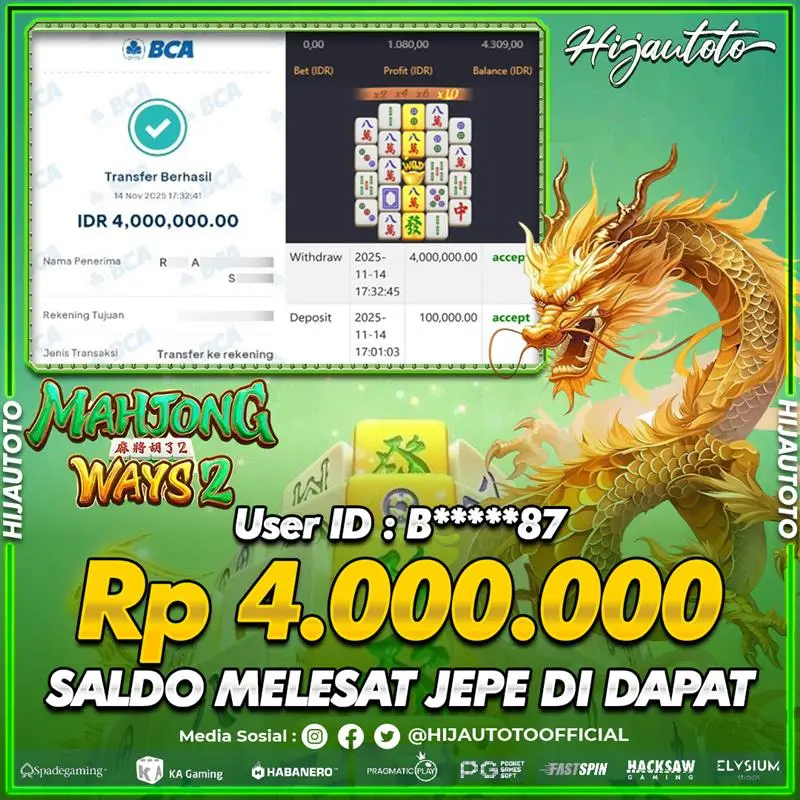 Selamat Kepada Member HIJAUTOTO B*****87 Telah Jackpot Di SLOT MAHJONG WAYS 2