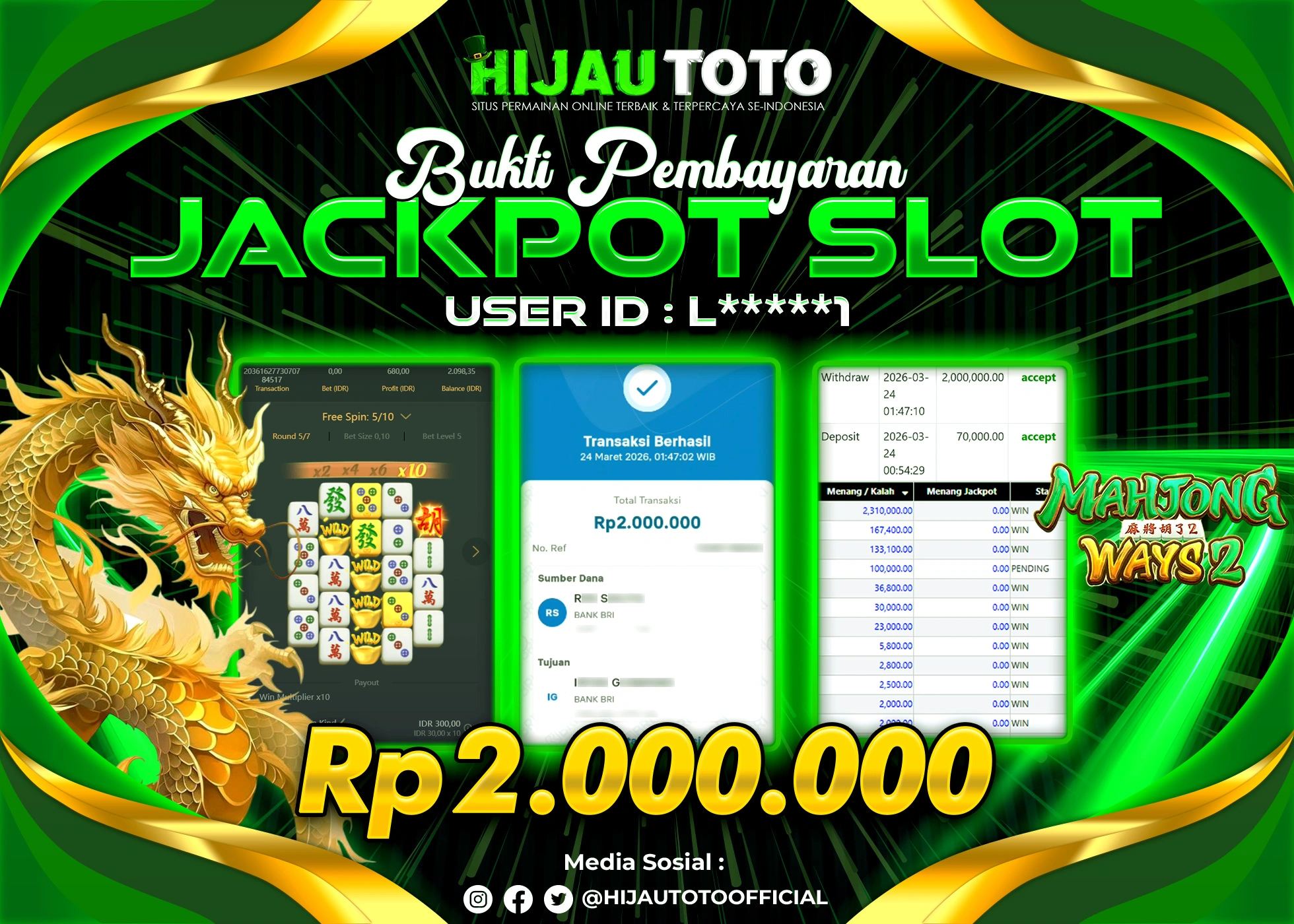 Bergabung dengan HIJAUTOTO sangat mudah dan cepat. Cukup lakukan pendaftaran dengan data lengkap, lakukan deposit minimal Rp5.000 melalui berbagai metode termasuk QRIS, dan mulai bertaruh dengan minimal taruhan Rp100. Dapatkan juga bonus new member 100% untuk modal bermain lebih besar.