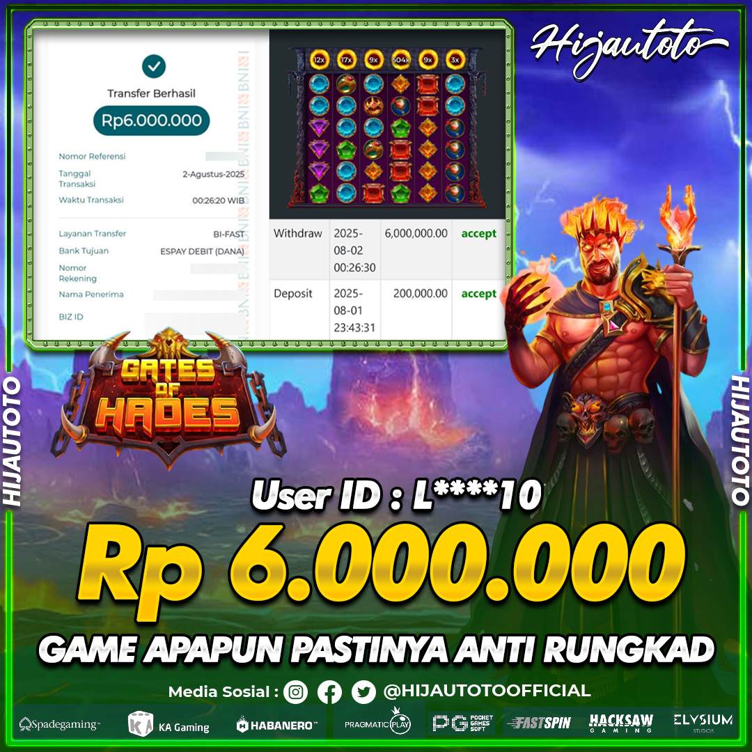 Selamat Kepada Member HIJAUTOTO L*****0 Telah Jackpot Di SLOT GATES OF HADES