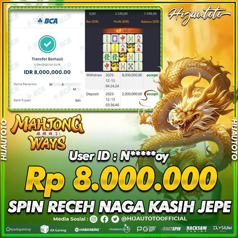 Selamat Kepada Member HIJAUTOTO N*****OY Telah Jackpot Di SLOT MAHJONG WAYS
