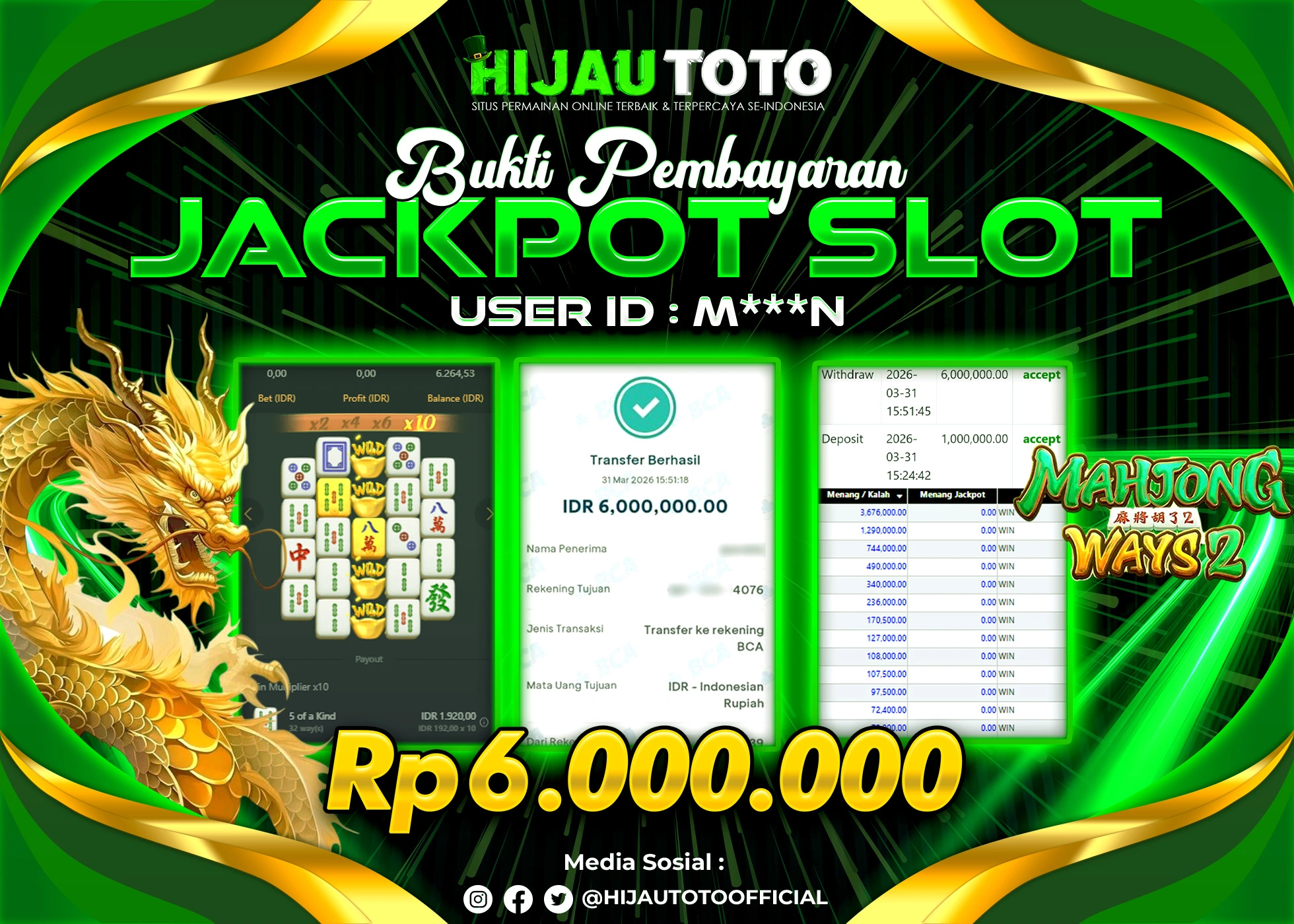 Bergabung dengan HIJAUTOTO sangat mudah dan cepat. Cukup lakukan pendaftaran dengan data lengkap, lakukan deposit minimal Rp5.000 melalui berbagai metode termasuk QRIS, dan mulai bertaruh dengan minimal taruhan Rp100. Dapatkan juga bonus new member 100% untuk modal bermain lebih besar.