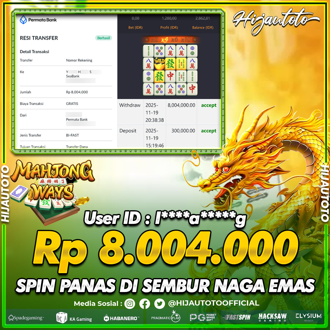 Selamat Kepada Member HIJAUTOTO I**********G Telah Jackpot Di SLOT MAHJONG WAYS
