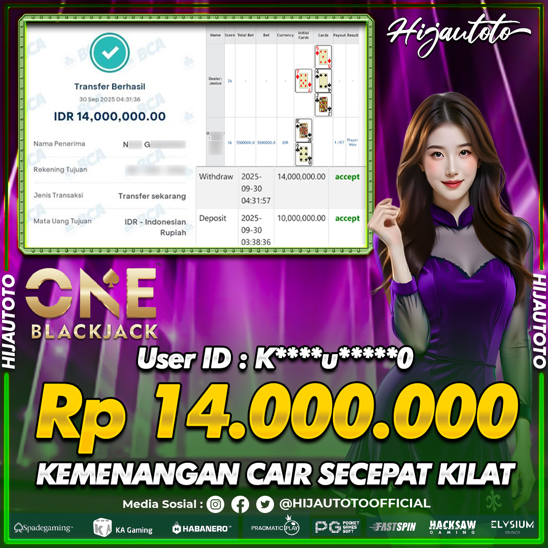 Selamat Kepada Member HIJAUTOTO K**********0 Telah Jackpot Di LIVE CASINO ONE BLACKJACK