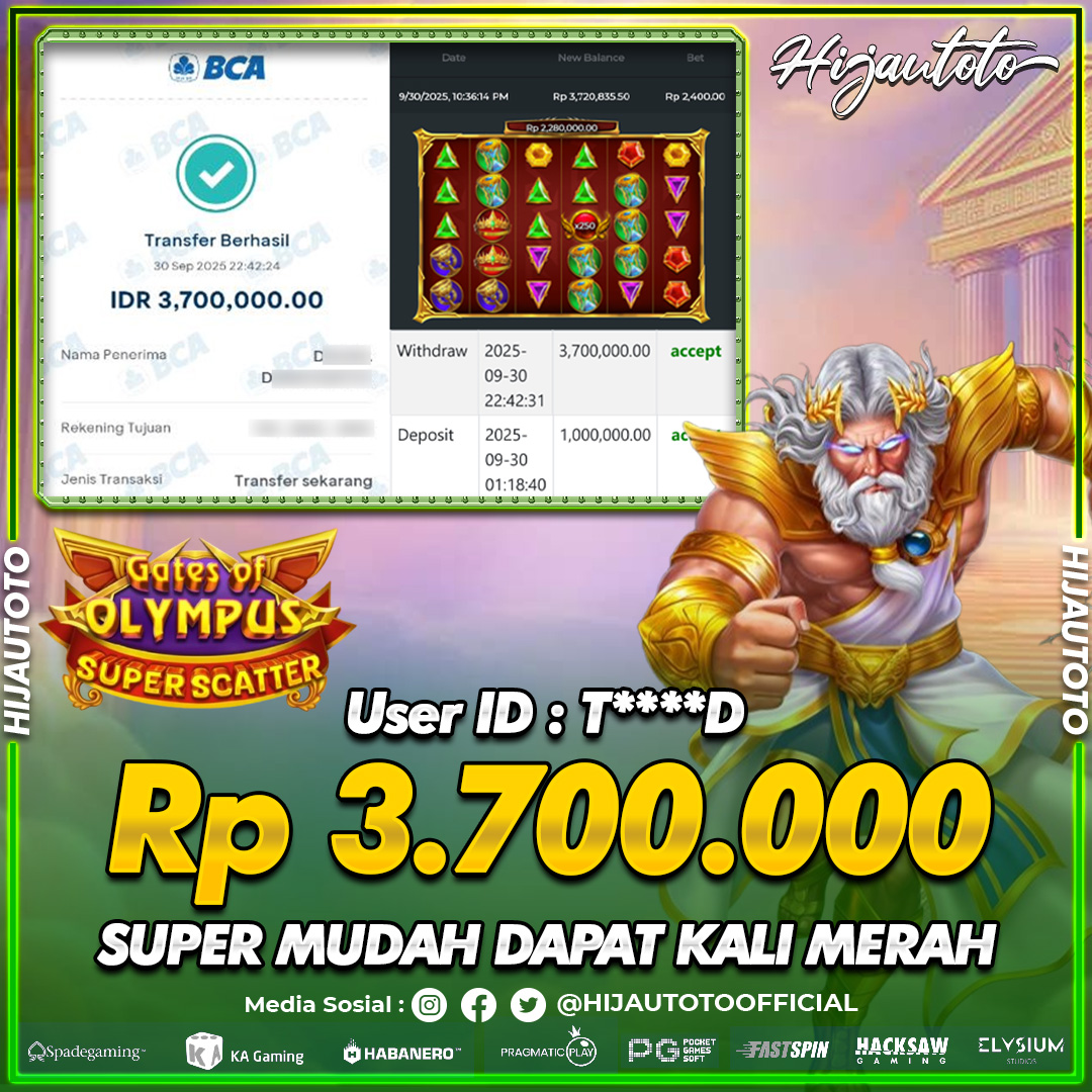 Selamat Kepada Member HIJAUTOTO T****D Telah Jackpot Di SLOT GATES OF OLYMPUS SUPER SCATTER