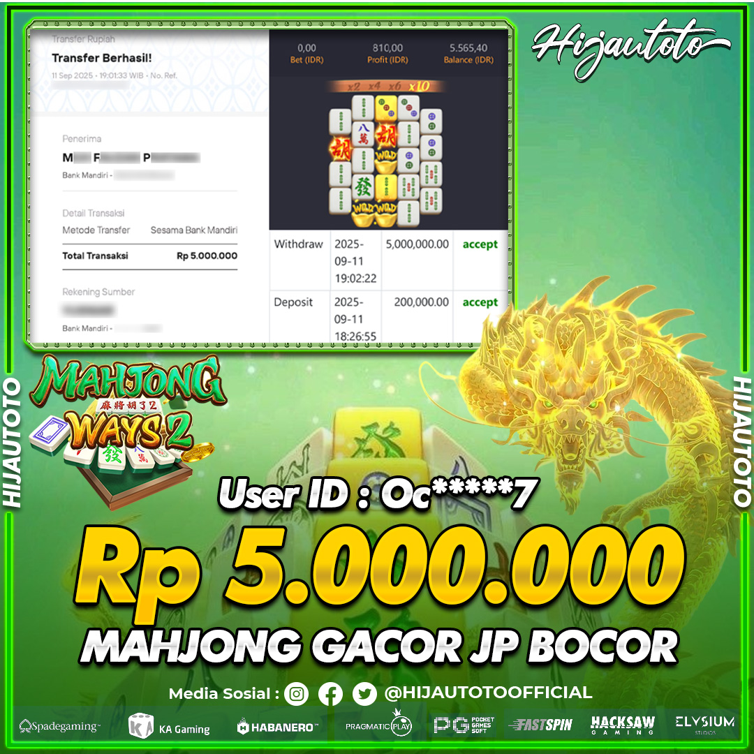 Selamat Kepada Member HIJAUTOTO OC*****7 Telah Jackpot Di SLOT MAHJONG WAYS 2
