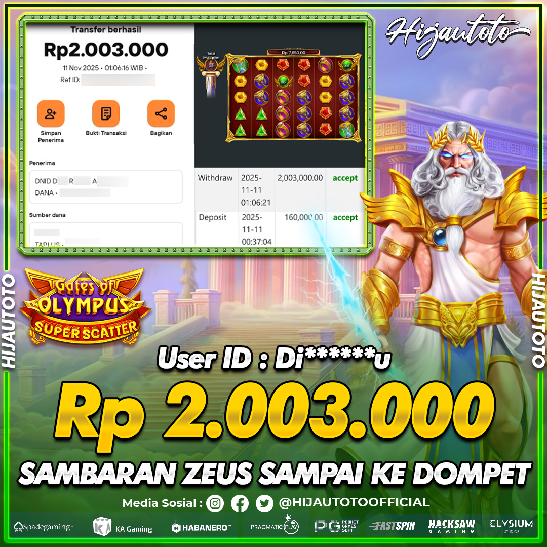 Selamat Kepada Member HIJAUTOTO AI*****2 Telah Jackpot Di SLOT GATES OF OLYMPUS SUPER SCATTER