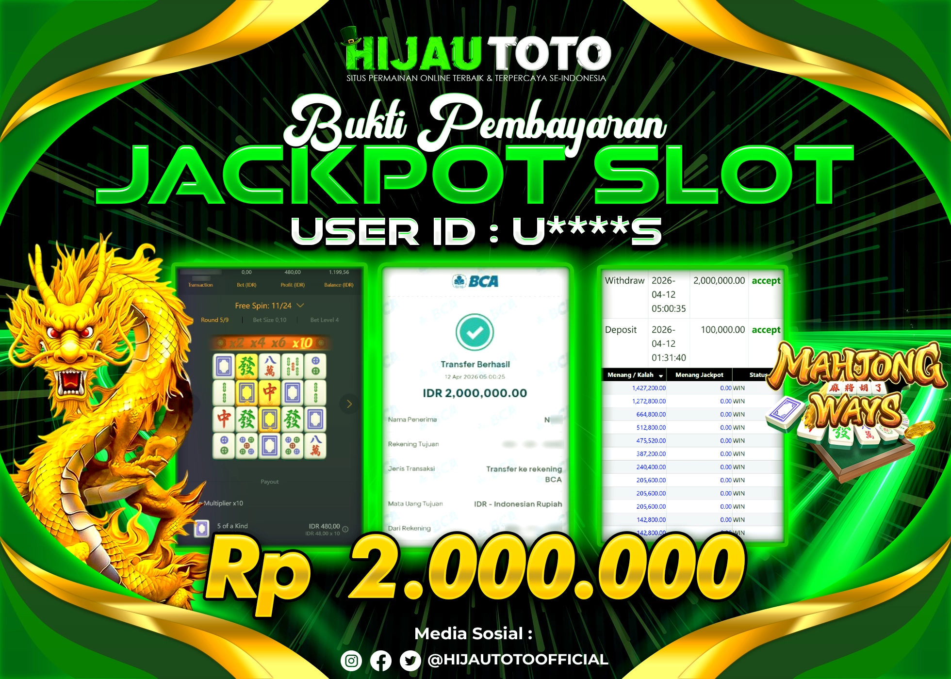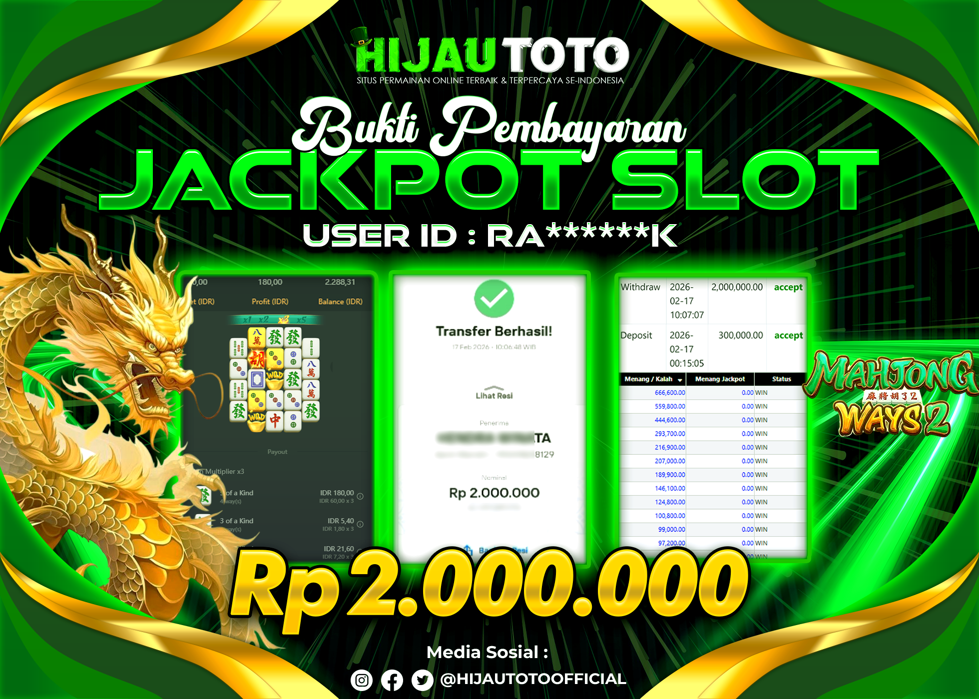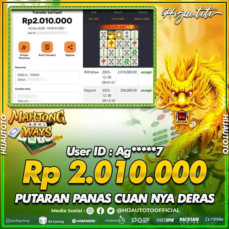 Karena berhasil memenangkan Rp.Rp.2.000.000 dari permainan seru SLOT MAHJONG WAYS di HIJAUTOTO! πŸ’°πŸ’Έ