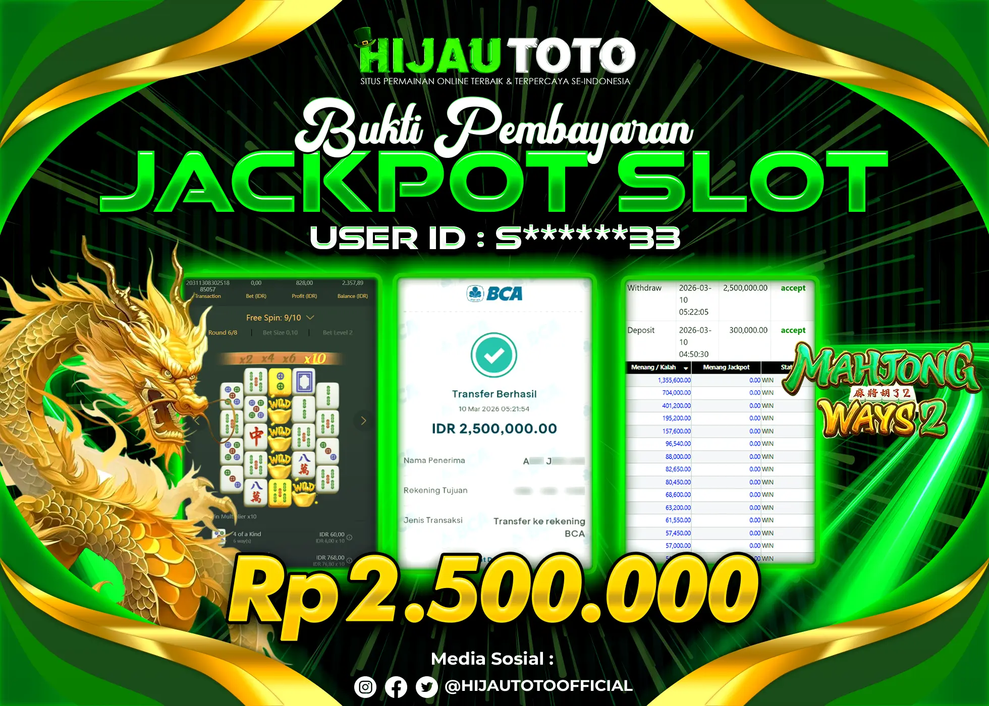 Selamat Kepada Member HIJAUTOTO S******33 Telah Jackpot Di SLOT MAHJONG WAYS 2