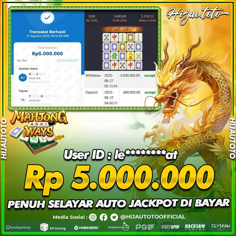 Selamat Kepada Member HIJAUTOTO U****S Telah Jackpot Di SLOT MAHJONG WAYS