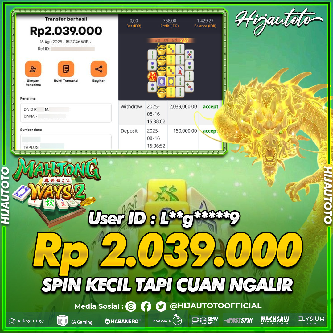 Selamat Kepada Member HIJAUTOTO L**G*****9 Telah Jackpot Di SLOT MAHJONG WAYS 2