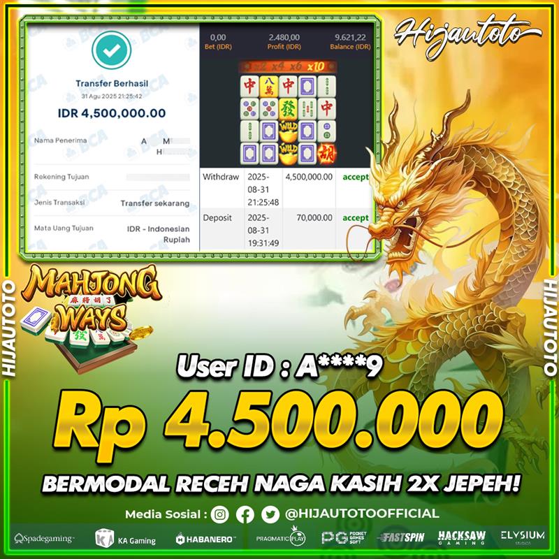 Karena berhasil memenangkan Rp.Rp.4.511.300 dari permainan seru SLOT MAHJONG WAYS di HIJAUTOTO! πŸ’°πŸ’Έ