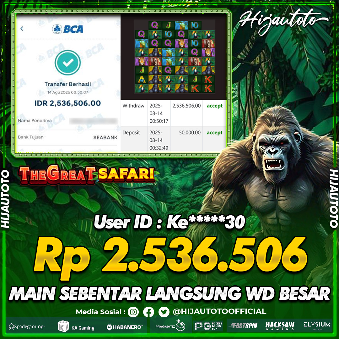 Selamat Kepada Member HIJAUTOTO KE*****30 Telah Jackpot Di SLOT THE GREAT SAFARI