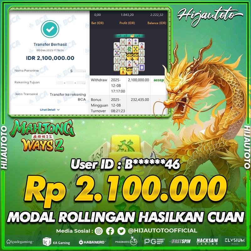 Selamat Kepada Member HIJAUTOTO B******46 Telah Jackpot Di SLOT MAHJONG WAYS 2