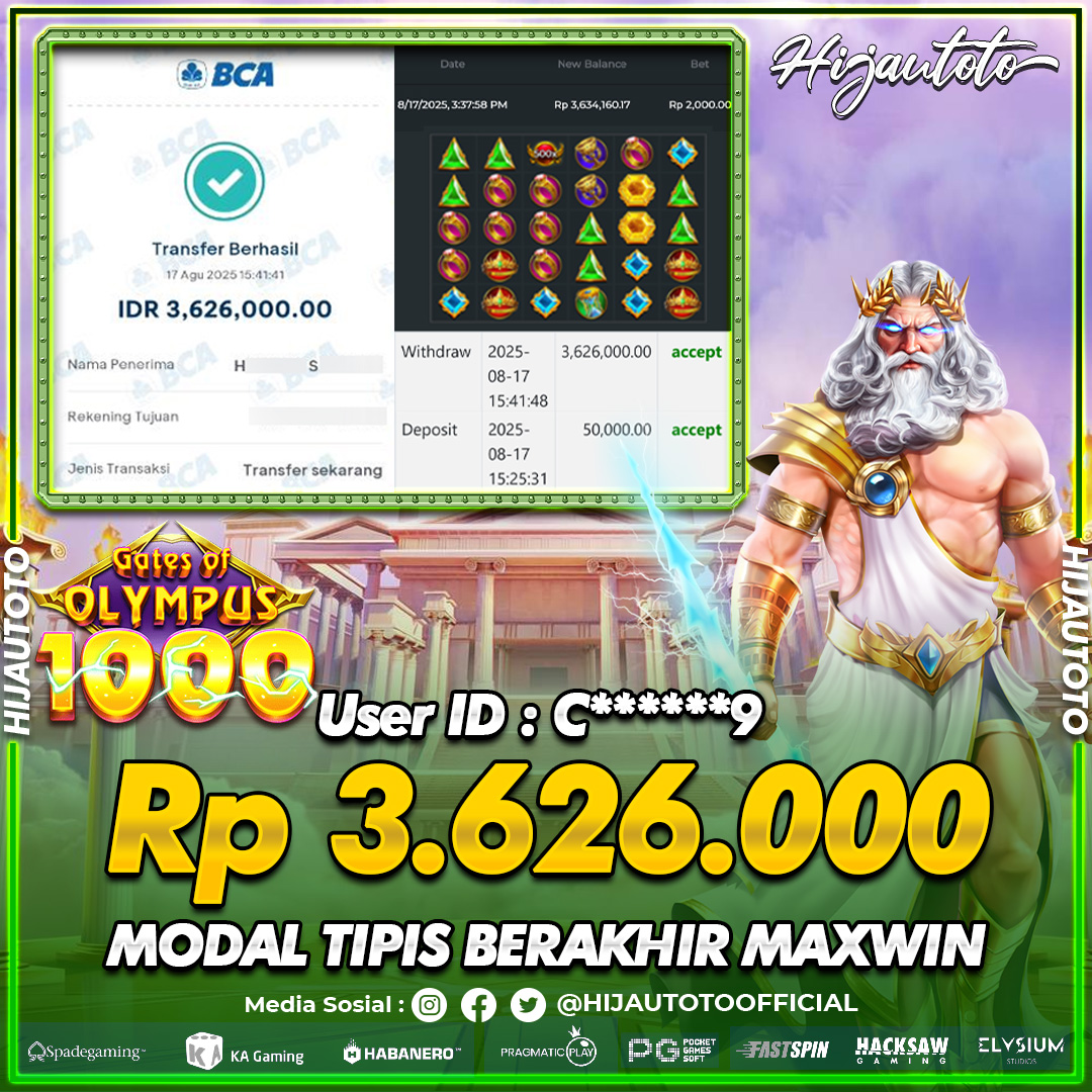 Selamat Kepada Member HIJAUTOTO C*******9 Telah Jackpot Di SLOT GATES OF OLYMPUS 1000