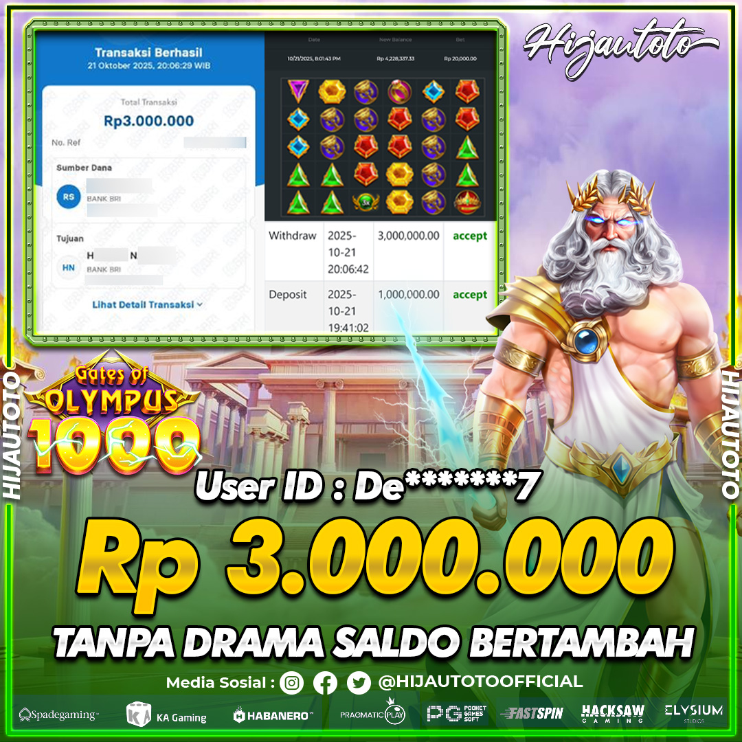 Selamat Kepada Member HIJAUTOTO DE*******7 Telah Jackpot Di SLOT GATES OF OLYMPUS 1000