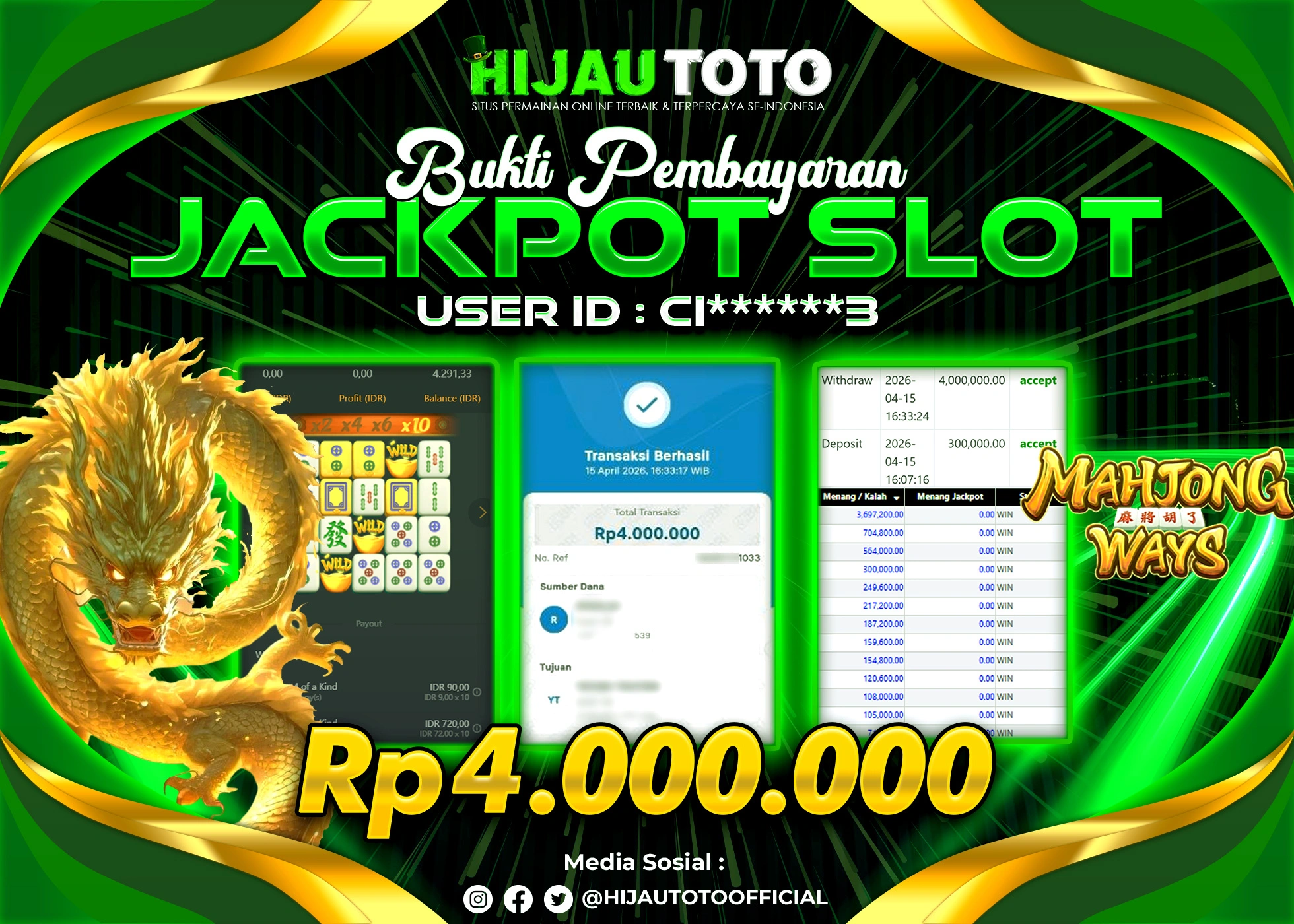Bergabung dengan HIJAUTOTO sangat mudah dan cepat. Cukup lakukan pendaftaran dengan data lengkap, lakukan deposit minimal Rp5.000 melalui berbagai metode termasuk QRIS, dan mulai bertaruh dengan minimal taruhan Rp100. Dapatkan juga bonus new member 100% untuk modal bermain lebih besar.